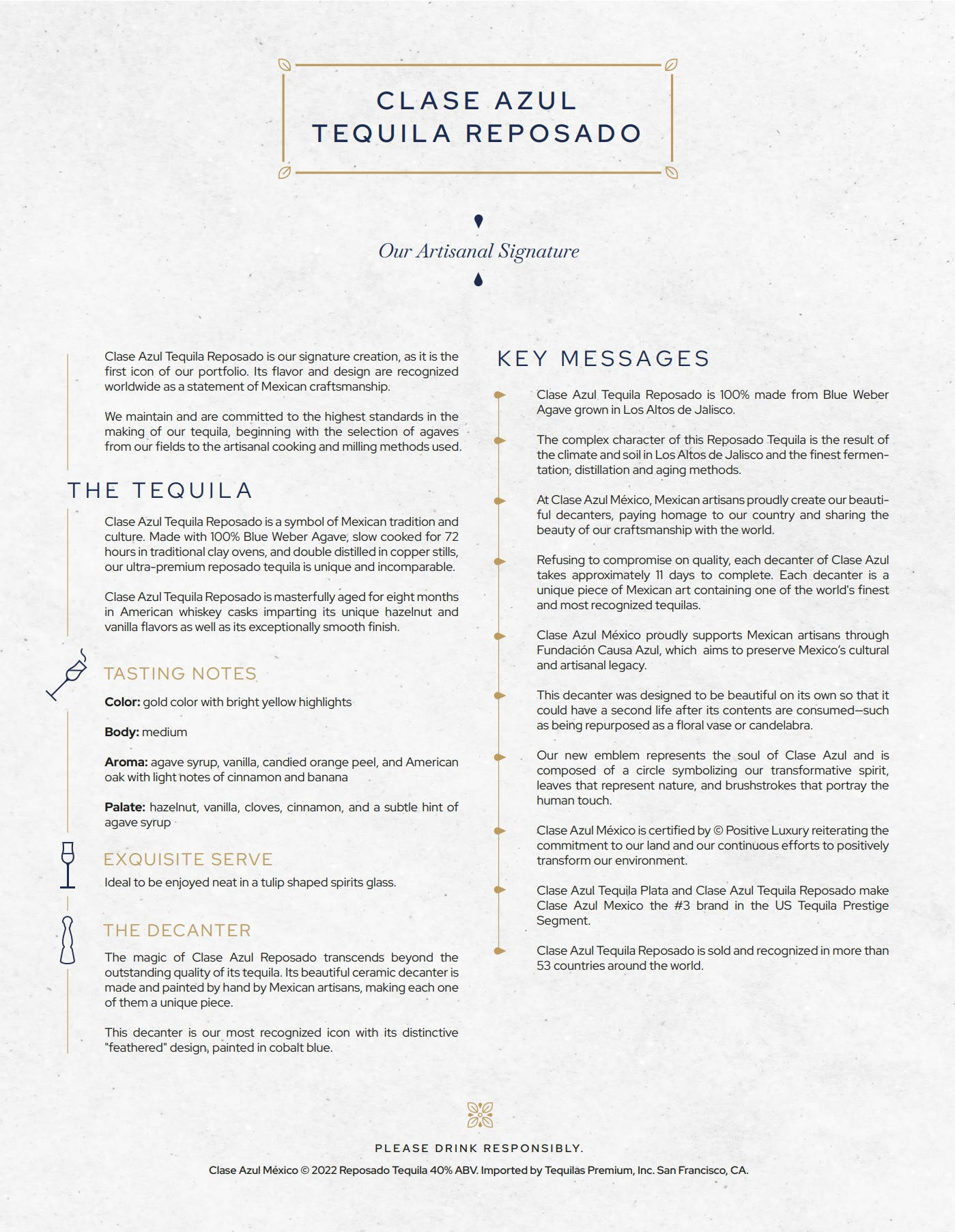 Clase Azul Reposado entsteht gleichsam aus der Berührung durch den menschlichen Geist. Inspiriert durch traditionelle mexikanische Werte, wird jede Flasche in der Manufaktur eines kleinen Dorfes in Mexiko handgefertigt und handbemalt. Jede Flasche ist ein Unikat.