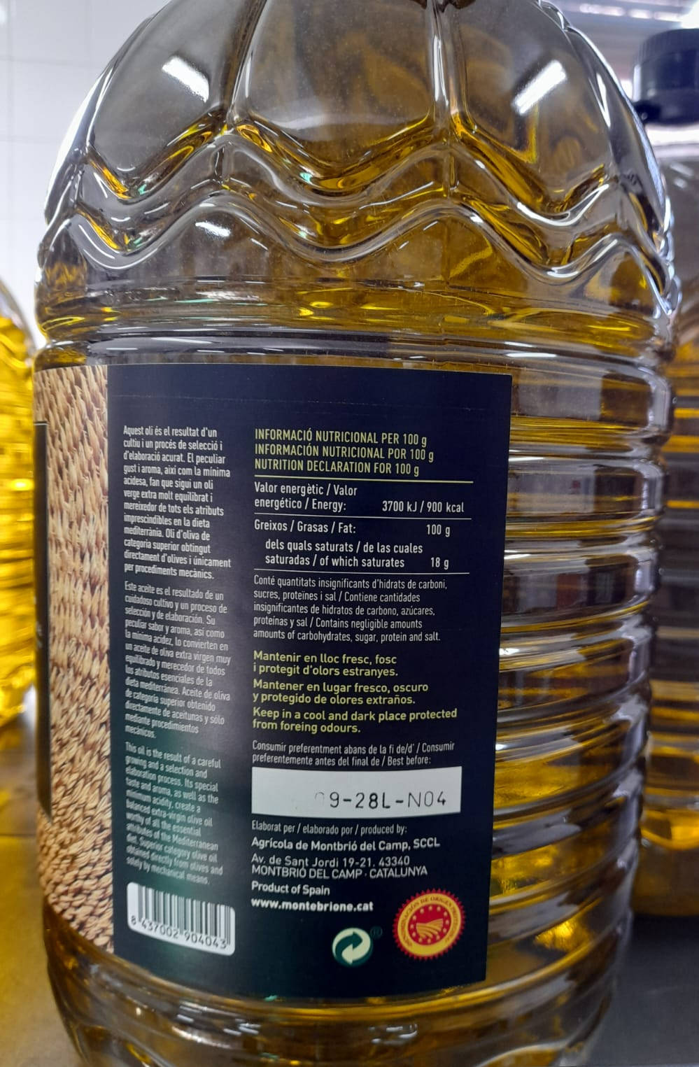 Dieses vielfach ausgezeichnete spanische Olivenöl kommt aus dem kleinen Städtchen Montbrió del Camp, welches 30 km landeinwärts der katalanischen Hafenstadt Tarragona liegt. Es ist das Resultat eines liebevollen Anbaus und der sorgfältigen Verarbeitung von Arbequina Oliven. Sein spezieller, leicht fruchtiger Geschmack, gepaart mit Aromen von Tomaten, Mandeln und Anis, so wie der geringe Säuregehalt, sind auf die "Kaltpressung" zurückzuführen. Da es sich bei diesem Olivenöl um ein komplett naturbelassenes Produkt handelt, können sich mit der Zeit Vertrübungen bzw. Sedimente bilden, die sich nicht qualitätsmindernd auswirken, sondern den Reifeprozess dieses Naturproduktes unterstreichen. Wichtigstes Kriterium für die Qualität sind Geruch und Geschmack.