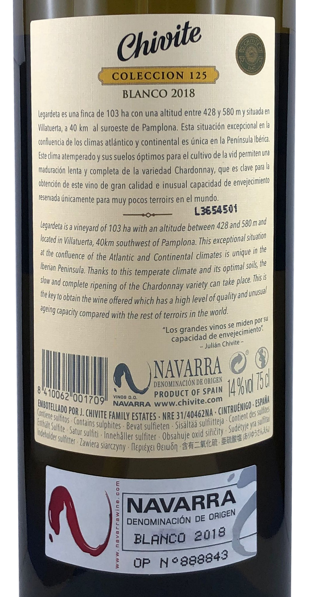 Hinweis: Die Abbildungen zeigen den hier angebotenen Chivite Coleccion 125 Chardonnay 2018.